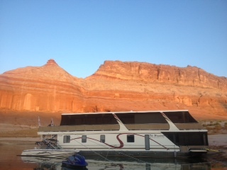 “Jeremy and I were invited to the Redmond Lake Powell company trip. When we were invited we hadn’t met anyone on the trip in person before. The trip sounded fun and we really like the Redmond products so we decided to go for it as we wanted to get to know people in the company. When we told our friends we were going to Lake Powell on a houseboat they would ask us who we were going with and we would have to pause and then tell them that we really didn’t know! That was the only odd part about it really. We flew to Arizona and Mike Mumford met us at the airport. We drove to the lake and Mike filled us in on what to expect and told us a little about the company. When we got to the lake we loaded our stuff into a ski boat and headed out on the lake to find where the 5 houseboats were anchored. I had never been to Lake Powell or on a houseboat so I really had no idea of what to expect. Jeremy had been to this lake many summers on houseboats growing up as a kid with his family. As we cruised along I was loving the sights of the red cliffs and rock formations all around the lake and the weather was perfect. Mike was pointing out formations so we would be able to recognize where in the lake we were so we would have reference points during our stay.