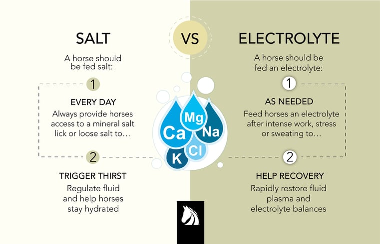 Horses lose tremendous amounts of salt and electrolytes (minerals that assist in hydration and keep muscles and nerves functioning smoothly) in sweat. And since electrolytes are not stored in the body, they must be replenished to help horses rehydrate and recover.