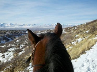 I can still feel my bruised ribs and swollen fingers from those unintentional dismounts. I was lucky Utah was knee deep in powder snow, so many of my falls were pretty soft. Fortunately, there have also been some huge benefits in our learning phase. I have learned that when Kourage starts to feel anxious, I can distract him from the worry, and keep him focused on his job, and on the trail. It certainly helps that horses can only focus on one thing at a time. This has helped settle him down when we come across some dogs, plastic bags and runners on the trail. He has also learned from the many miles we have put in this winter to relax and enjoy the rides. He has begun to lead the two or three companions we ride with and his endurance heritage is beginning to surface with his long strides and eager trot.